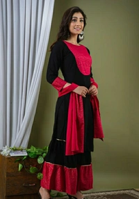 L (Bust Size: 42 in, Shoulder Size: 12 in, Kurta Waist Size: 40 in, Kurta Hip Size: 44 in, Kurta Length Size: 42 in, Bottom Waist Size: 36 in, Bottom Hip Size: 46 in, Bottom Length Size: 28 in)